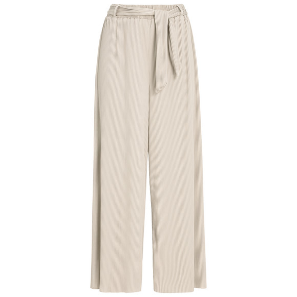 Weit geschnittene Plissee-Culotte in unifarben Beige. Breiter Elastikbund mit passendem Bindegürtel in fünf Gürtelschlaufen. Luftig leichte Qualität.