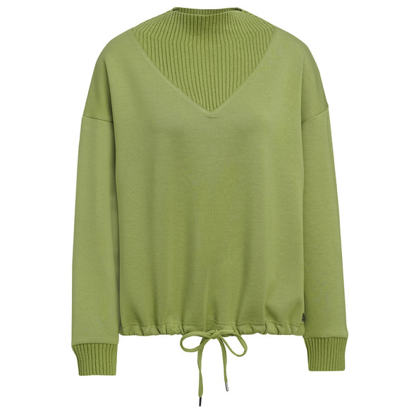 Grüner Pullover mit Modal-Anteil und geripptem Strickeinsatz am Ausschnitt und an den Ärmeln. Tunnelzug im Saum.