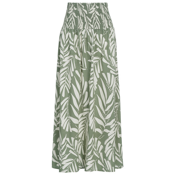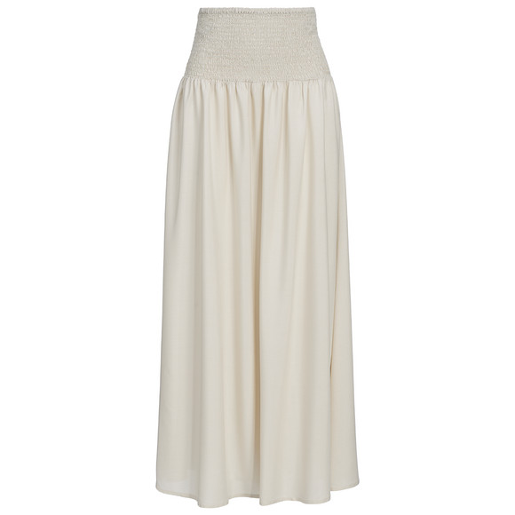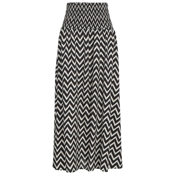 Schwarz-cremefarbener Rock aus leicht fließender Viskoe und mit Allover-Print. Mit extra breitem Smokbund für hohen Tragekomfort. Ausgestellte Passform und knöchellang geschnitten.
