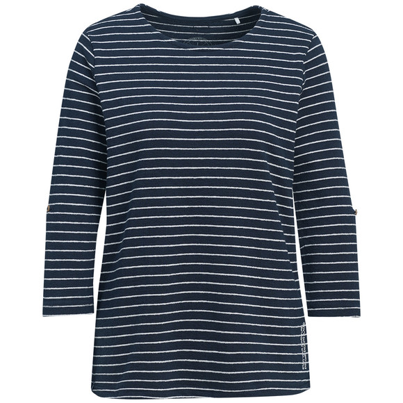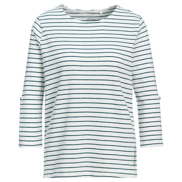 Mintgrün-weiß gestreiftes Shirt aus Baumwolle mit feiner Struktur. Rundhalsausschnitt und 3/4-Arm mit Turn-up-Funktion, zum Krempeln auf halbe Ärmellänge. Kleiner Message-Print seitlich links am Saum.