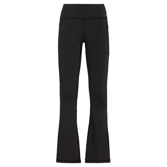 Schwarze Hose aus atmungsaktivem Funktionsmaterial. Extrabreiter Elastikbund mit kleinem Print. Zwei Taschen seitlich am Bein. Weite, lockere Form mit geradem Bein und am Beinabschluss mit Schlag.
