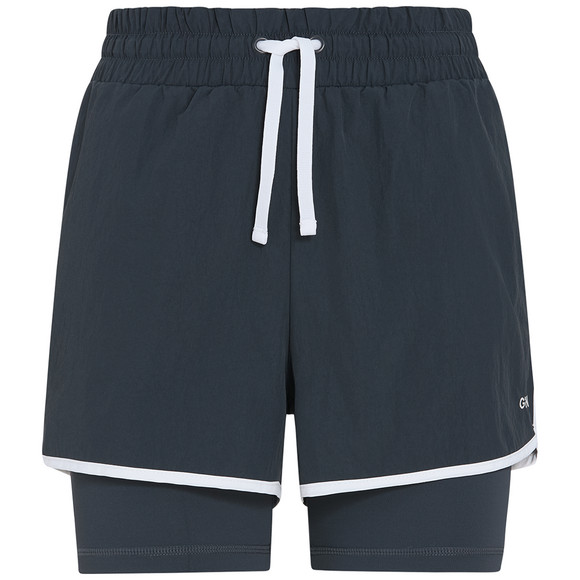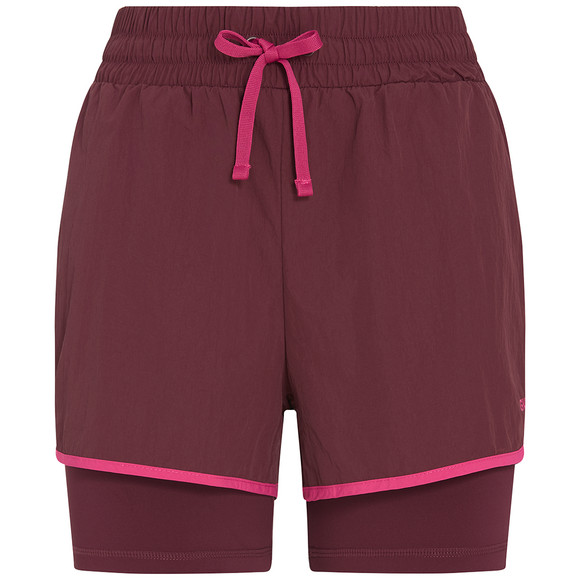 Zweilagige Sport-Shorts in Weinrot. Obere Lage aus besonders leichtem Material und mit Einschubtaschen. Untere Lage ebenfalls in Dunkelblau aus bequemem Stretch-Material. Elastikbund mit Tunnelzug für hohen Tragekomfort. Kleiner gestickter Marken-Schriftzug auf dem linken Bein.