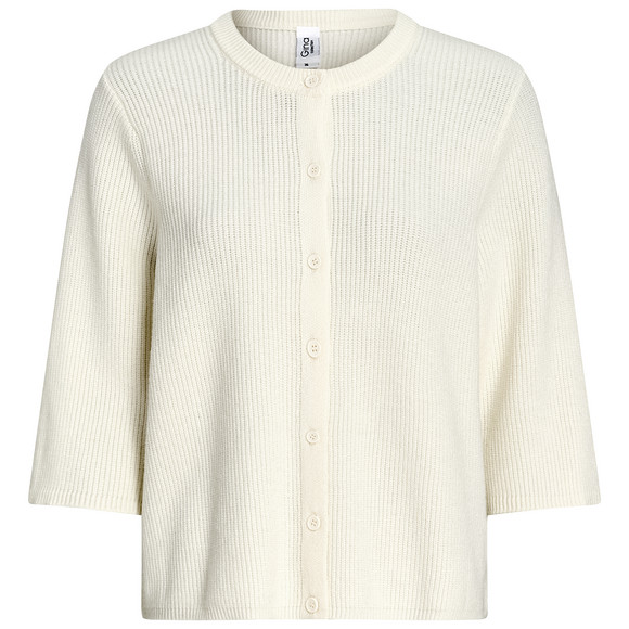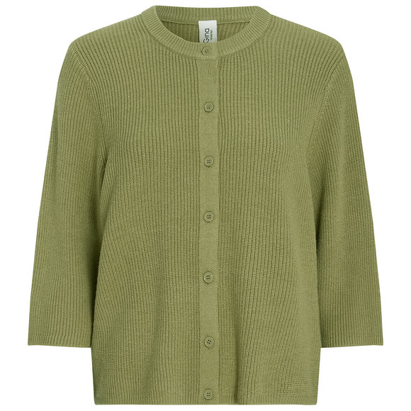 Olivgrüne Strickjacke aus weichem Viskose-Mix und mit halblangen Ärmeln. Mit Rippstruktur und Rippbündchen. Durchgängige Knopfleiste vorne.