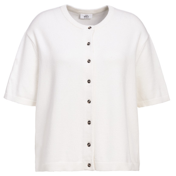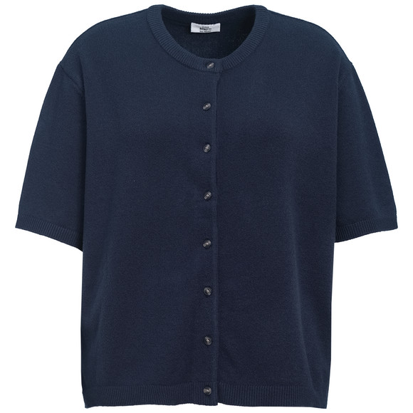 Dunkelblaue Strickjacke aus einem weichen Viskose-Mix mit Rundhalsausschnitt, kurzen Ärmeln und Knopfleiste. Mit gerippten Bündchen.