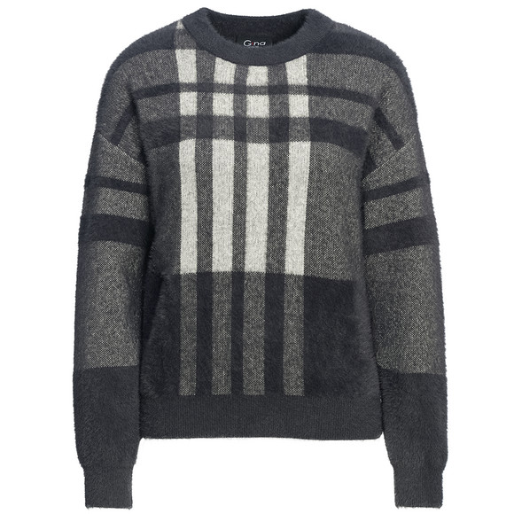 Hellblauer Strickpullover in besonders weicher Qualität und mit Karomuster allover. Mit geripptem Bündchen am Rundhalsausschnitt, den Armausschnitten sowie am Saum.