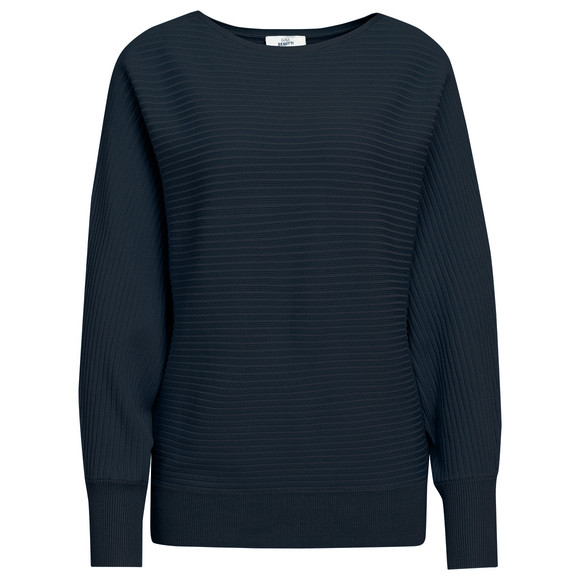 Roter Rippstrickpullover aus Viskose-Mix-Qualität mit Rundhalsausschnitt und Fledermaus-Ärmeln. An den Armausschnitten sowie am Saum mit breiten Bündchen.