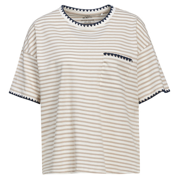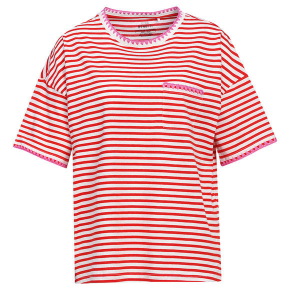 Rot-creme gestreiftes T-Shirt aus zertifizierter Bio-Baumwolle. Mit pinker Stickerei am Rundhalsausschnitt, Ärmeln und an der Brusttasche. Weit geschnitten.