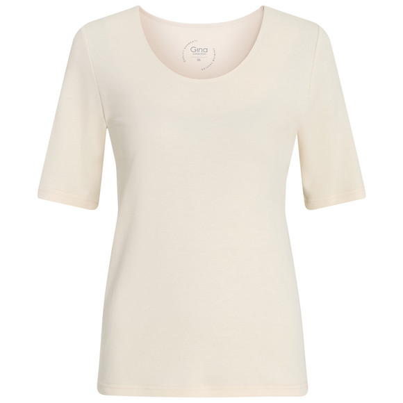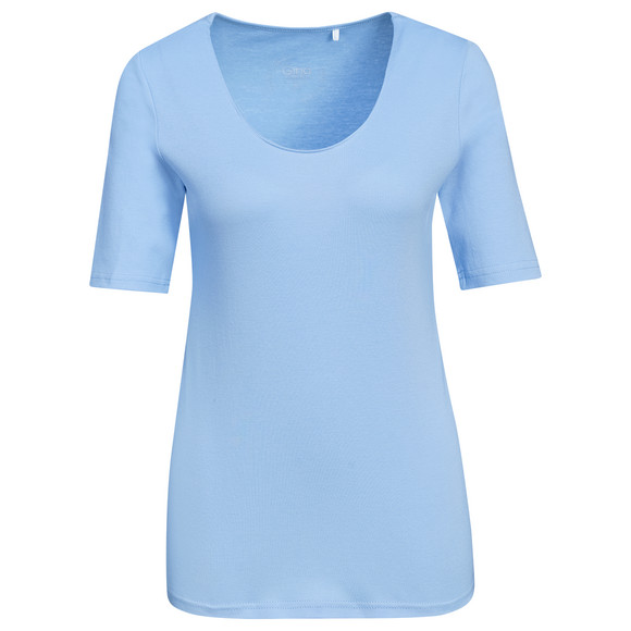 Hellblaues T-Shirt aus einem Modal-Mix und im Basic-Style. Mit schmaler Paspelierung am Rundhalsausschnitt.
