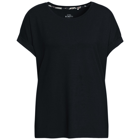Unifarbenes T-Shirt in Schwarz mit hohem Viskoseanteil. Überschnittene kurze Ärmel mit fixierten Umschlägen. Lockere Passform mit Rundhalsausschnitt.