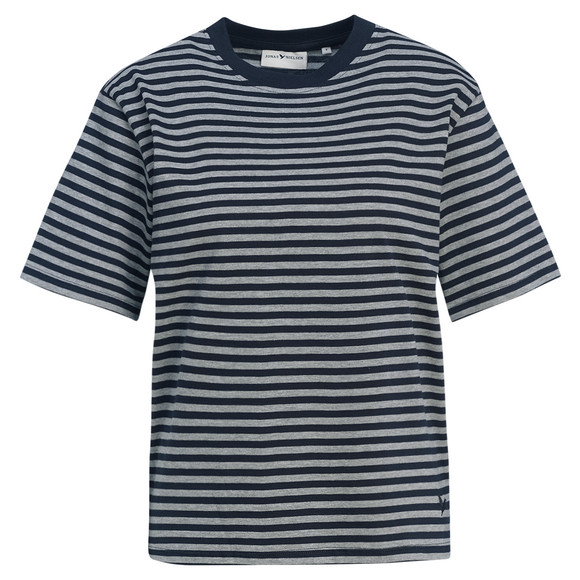 Blau-schwarz gestreiftes T-Shirt aus zertifizierter Bio-Baumwolle mit feinem Rippenbündchen am runden Halsausschnitt. Kleine Markenlogo-Stickerei vorne links über dem seitlich geschlitzem Saum.