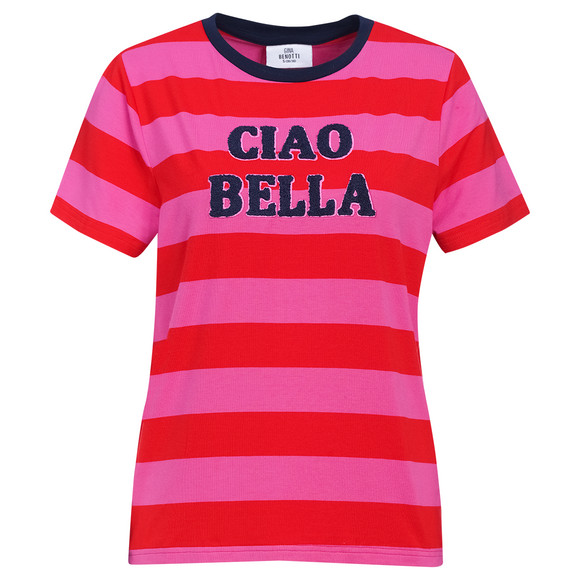 Rot-pink gestreiftes T-Shirt aus einem Viskose-Mix mit dunkelblauem Bündchen am Rundhalsausschnitt und großem Frottee-Schriftzug auf der Brust. Saum hinten leicht abgerundet.