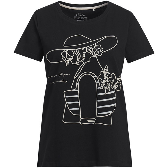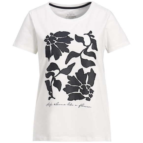 Weißes T-Shirt mit abstraktem Motiv als Print im Brustbereich, mit Zierperlen als Detail. Rundhalsausschnitt mit schmalen Bündchen. Gerade geschnitten.