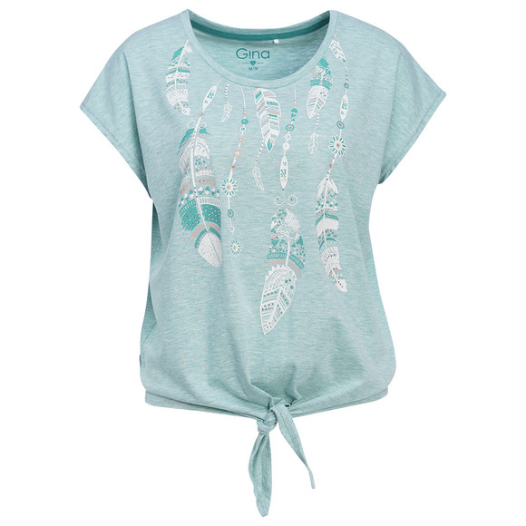 Dunkelblau meliertes T-Shirt mit feinem Bündchen am runden Halsausschnitt und mit überschnittenen Ärmeln. Mit weißem Traumfänger-Motiv bedruckt und Knotendetail am Saum.