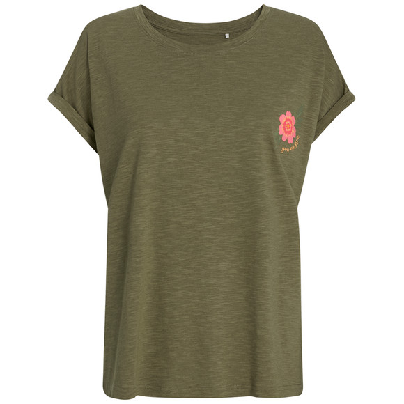 Dunkelgrünes T-Shirt mit Flammgarn in leichter Qualität. Großer Schriftzug-Print auf der Front. Rundhalsausschnitt mit angesetztem Bündchen. Fixierte Umschläge an den überschnittenen Ärmeln. Locker gerade geschnitten.