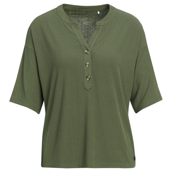 Beiges T-Shirt mit feinen strukturierten Streifen, kurzem Stehkragen und kurzer Knopfleiste am V-Ausschnitt. Mit überschnittenen Ärmeln und kleinem Metall-Label vorne links am Saum. Lockere Passform.