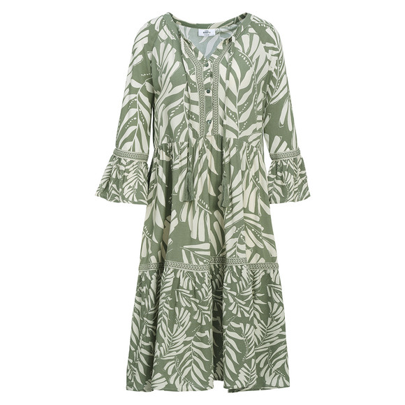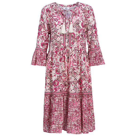 Cremefarbenes Tunika-Kleid aus Viskose und mit pink-rosafarbenem Allover-Muster. Am Halsausschnitt mit Bindeband und kurzer Knopfleiste vorne. Mit Volant an den Ärmeln sowie am Rockteil. Leichte Qualität und ausgestellt geschnitten.