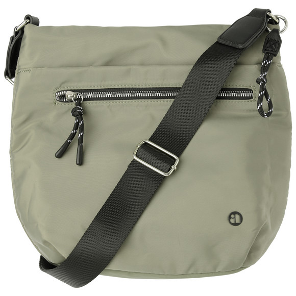 Olivgrüne Crossbody-Bag mit kleiner Applikation und Kordel-Anhänger für einen sportiven Look. Ein großes Reißverschluss-Hauptfach mit zwei Steckfächern und einem Reißverschlussfach innen. Auf der Vorderseite ein Steckfach mit Magnetverschluss sowie ein weiteres Reißverschlussfach. Längenverstellbarer Tragegurt in Schwarz mit Details aus Lederimitat.