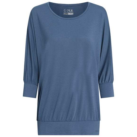 Weich fließendes Yoga-Shirt in Blau mit paspeliertem, weitem Rundhalsausschnitt, 3/4-Arm und Ziernaht im Rücken. An den Ärmeln und am Saum mit breiten angesetzten Bündchen für einen guten Sitz. Gummierter Marken-Schriftzug vorne links am Saum.
