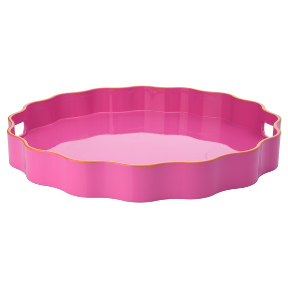Pinkes Deko-Tablett in runder Form aus Kunststoff. Mit welligem Rand und zwei Tragegriffen.
