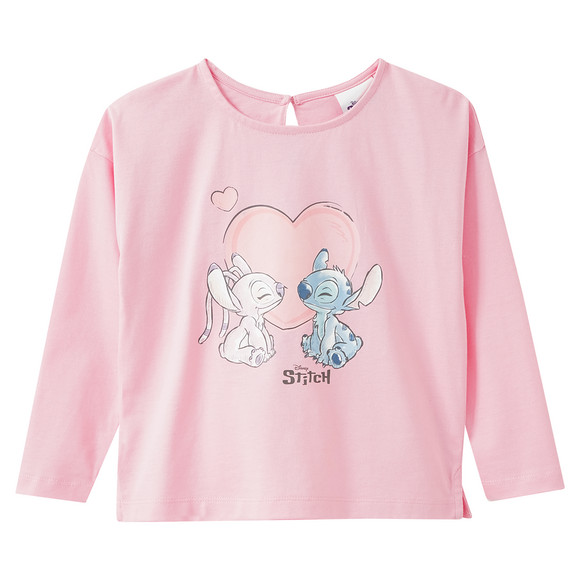Weißes Langarmshirt aus zertifizierter Bio-Baumwolle mit großen "Stitch"-Print vorne und mit Knöpfung im Nacken. Mit Rundhalsauschnitt und leicht geschlitzem Saum an den Seiten.