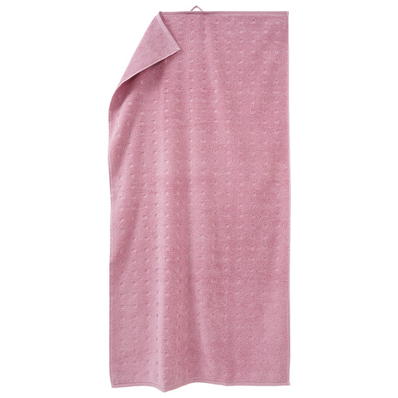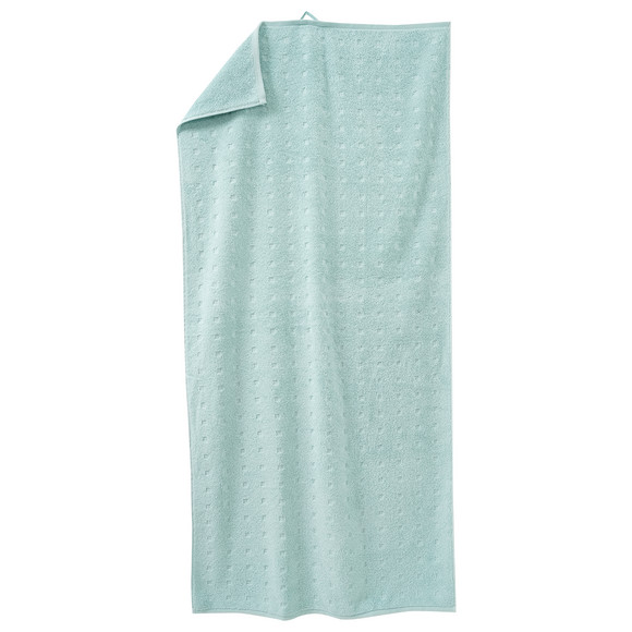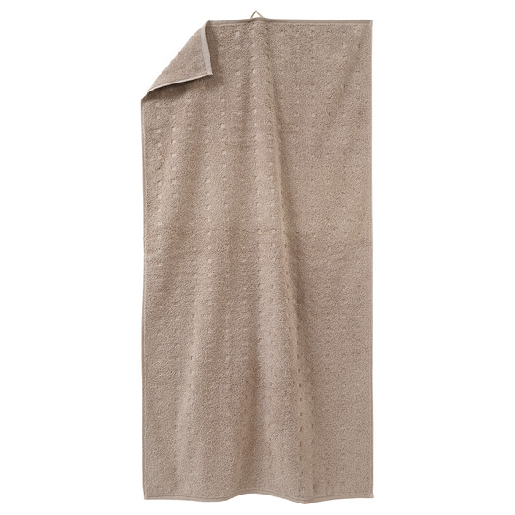 Hellgraues Duschtuch aus saugstarker Frottee-Qualität mit kleinen Quadraten als eingewebtes Muster. Rundum gesäumt und mit praktischer Schlaufe zum Aufhängen.