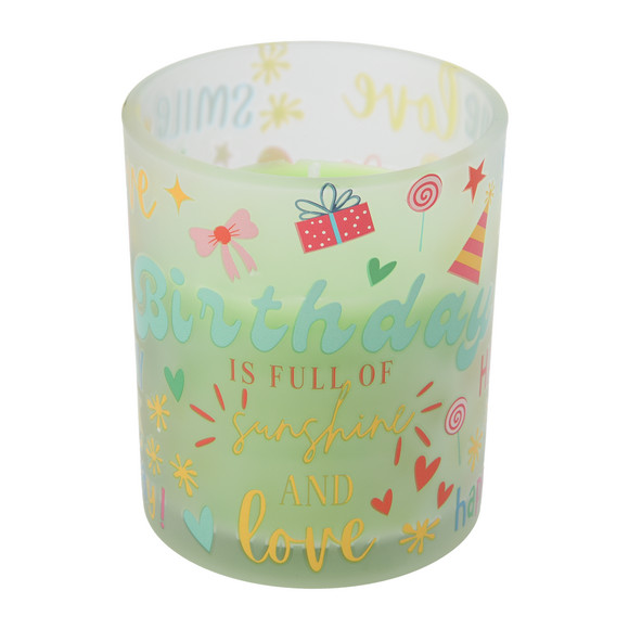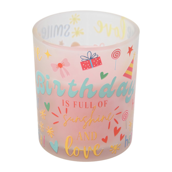 Rosa Kerze im satinierten Glas mit bunten Motiven und Schriftzügen verziert. Maße ca. 6 x 7 cm (ØxH).