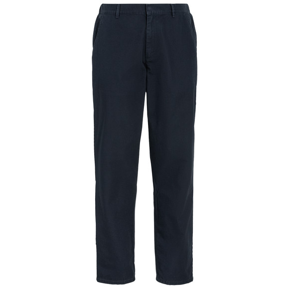 Dunkelblaue Chinohose aus angenehmer Baumwolle. Druckknopf und Reißverschluss für ein angenehmes An- und Ausziehen, sowie ein elastischer Einsatz hinten im Bund für einen hohen Tragekomfort. Fünf Gürtelschlaufen. Zwei Einschubtaschen vorne und zwei Gesäßtaschen. Lockere Passform.