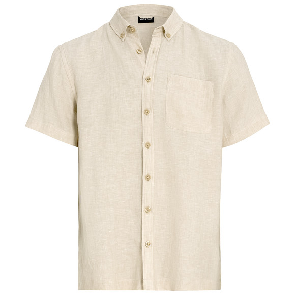 Leichtes Leinenhemd in Beige mit Button-Down-Kragen und klassischer Knopfleiste. Kurze Ärmel, Brusttasche auf der linken Seite und seitlich geschlitzter Saum.