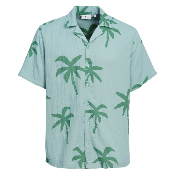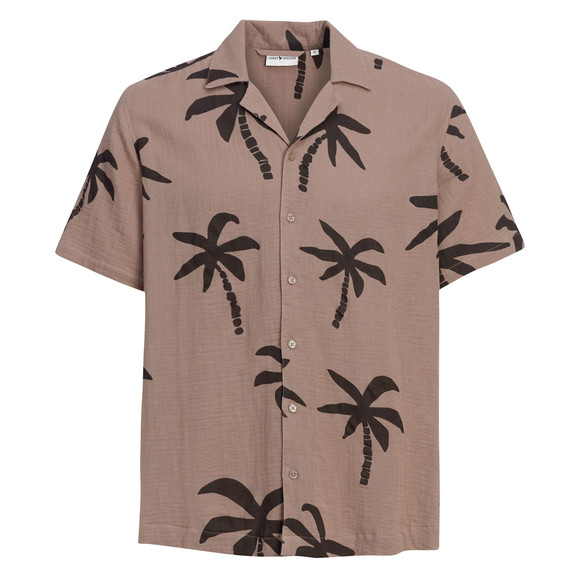 Hellbraunes Musselin-Hemd aus Bio-Baumwolle mit kurzen Ärmeln und Palmen-Allover. Mit Kent-Kragen und Knopfleiste. Saum seitlich geschlitzt.