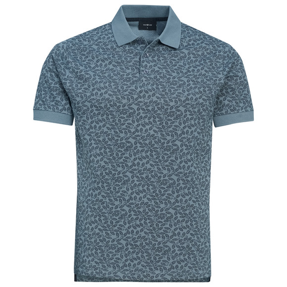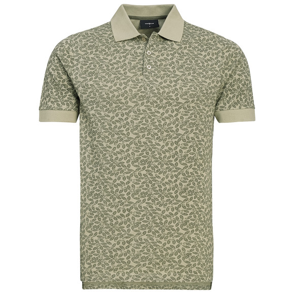Olivgrünes Poloshirt in beliebter Piqué-Qualität mit floralem Allover-Print und dreifacher Knopfleiste auf der Front. Gerippte Armausschnitte und seitlich am Saum geschlitzt.