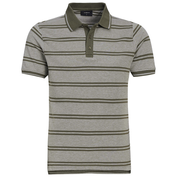 Meliertes gestreiftes Poloshirt in Olivgrün aus reiner Baumwolle mit Piqué-Struktur. Polokragen mit kleiner Bordüre und mit Knopfleiste vorne. Kurze Ärmel mit Rippabschluss und seitlich geschlitzer Saum. Bequem sitzende Passform.