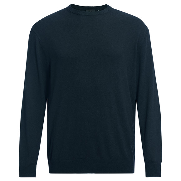 Leichter Feinstrickpullover in Dunkelblau im klassischen Dessin mit gerippten Rundhalsausschnitt. Mit gerippten Abschlüssen an den Armausschnitten sowie Saum.