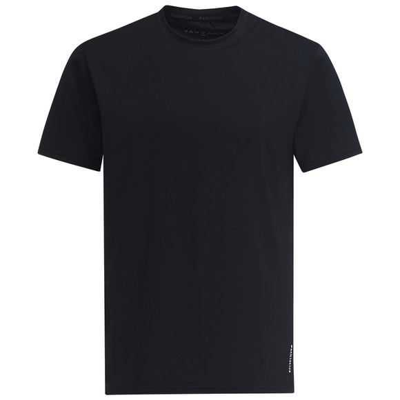 Sportlich unterwegs! Schwarzes T-Shirt aus leichtem Material mit kleinem, reflektierendem Schriftzug links am Saum. Mit feinem Bündchen am Rundhalsausschnitt.