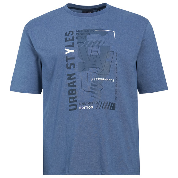 Blaues T-Shirt mit angenehmer Baumwolle. Mit Rundhalsausschnitt und mit großem Print auf der Front. Weit geschnitten.