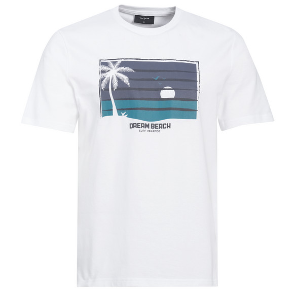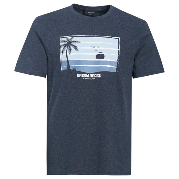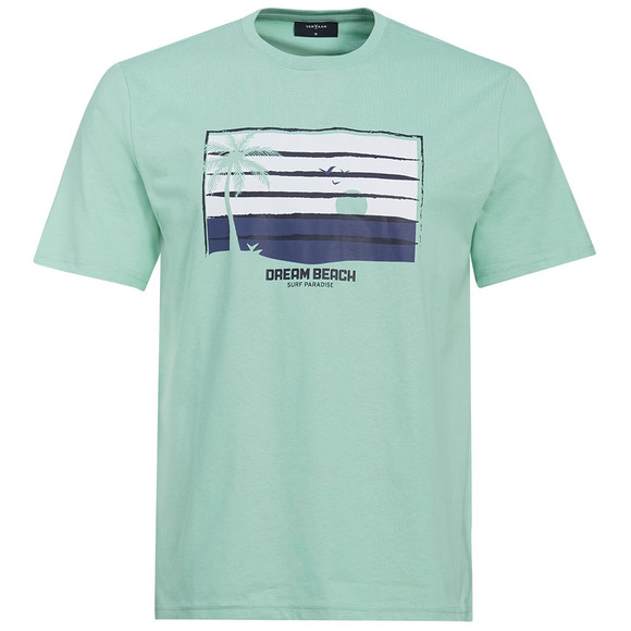 Hellgrünes T-Shirt aus einem angenehmen Material-Mix mit hohem Baumwoll-Anteil. Runder Halsausschnitt und großer Print auf der Front mit Strand-Motiv.