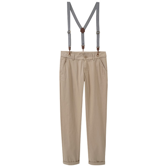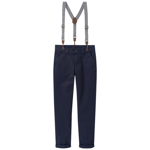 Dunkelblaue Chinohose mit abknöpfbaren, elastischen Hosenträgern im Streifen-Look. Mit zwei Gesäßtaschen, zwei Einschubtaschen vorne, verstellbarem Bund und vier Gürtelschlaufen. Schließbar mit Knopf und Reißverschluss. Die Beinausschnitte können umgeschlagen werden.