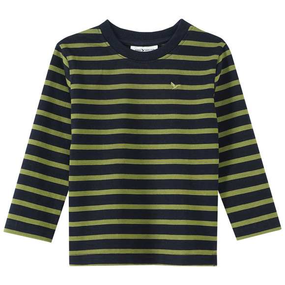 Petrolfarbenes Langarmshirt aus zertifizierter Bio-Baumwolle im dunkelblauen Ringel-Look. Mit dunkelblauem Rippenbündchen am Rundhalsausschnitt und kleiner Logo-Stickerei auf der linken Brust. Saum seitlich geschlitzt.