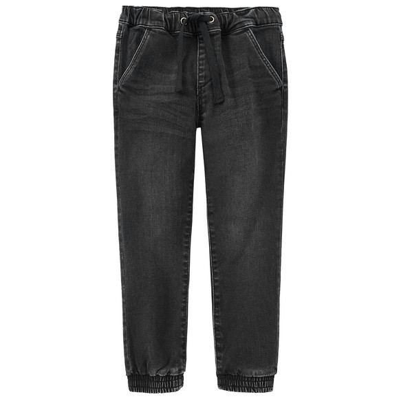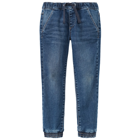 Blaue Jeans aus stretchigem Denim mit permanenter Faltenwaschung und Used-Waschung. Mit verstärkten Ösen und Tunnelzug am elastischen Bund sowie je zwei Einschub- und Gesäßtaschen. Lockere Passform mit elastischen Beinausschnitten.