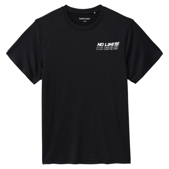 Schwarzes Sport-T-Shirt mit Rundhalsausschnitt und kleinem Print vorne. Aus leichtem Funktionsmaterial. Locker gerade geschnitten.