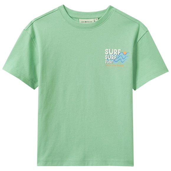 Hellgrünes T-Shirt aus zertifizierer Bio-Baumwolle mit Surf-Print auf der Brust. Rundhalsausschnitt mit fein geripptem Bündchen.