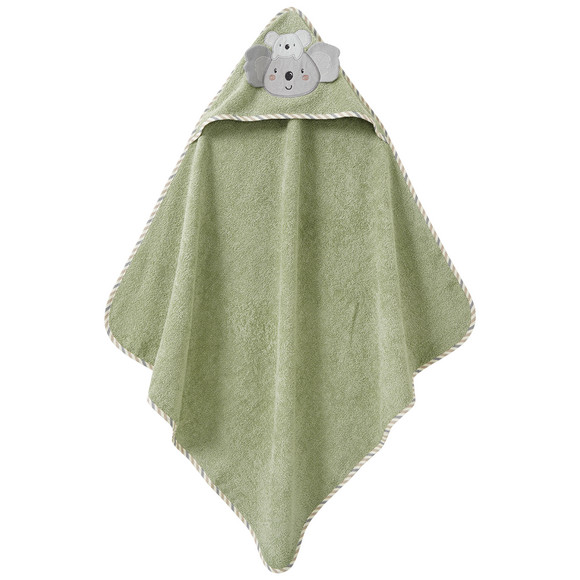 Kuscheliges Kapuzentuch aus weichem Baumwoll-Frottee in Grün mit niedlicher Koala-Applikation. An den Ausschnitten mit Paspelierung ausgestattet.