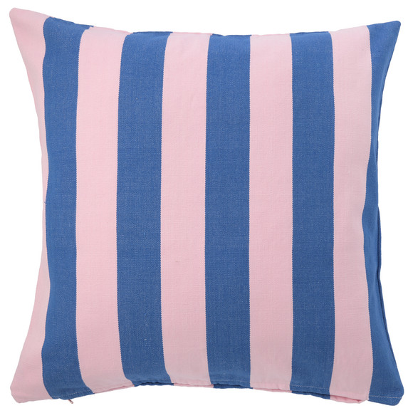 Kissenhülle aus angenehmer Baumwolle in Blau mit rosa Streifen im Retro-Look. Mit Reißverschluss. Ohne Füllung.