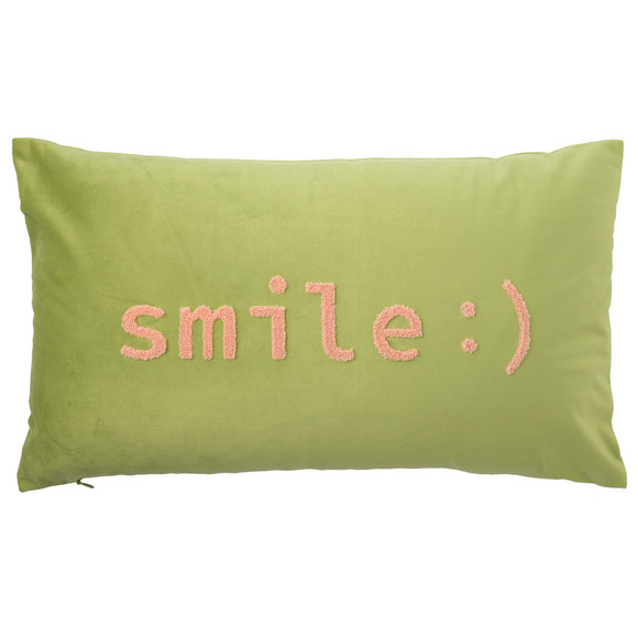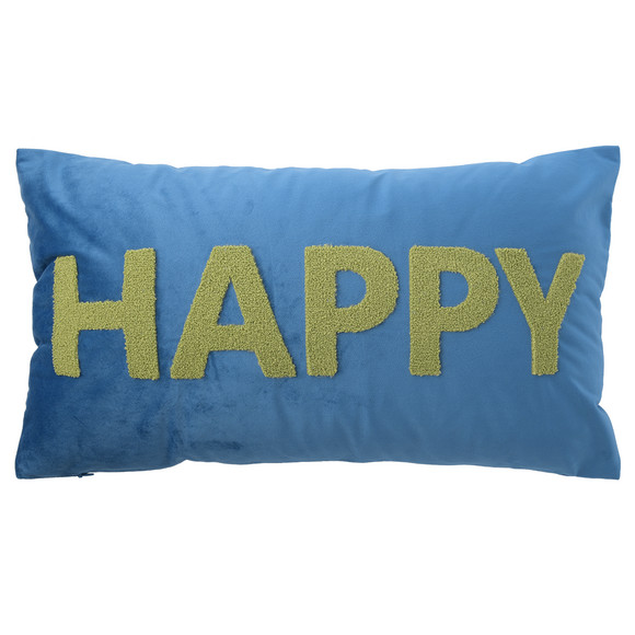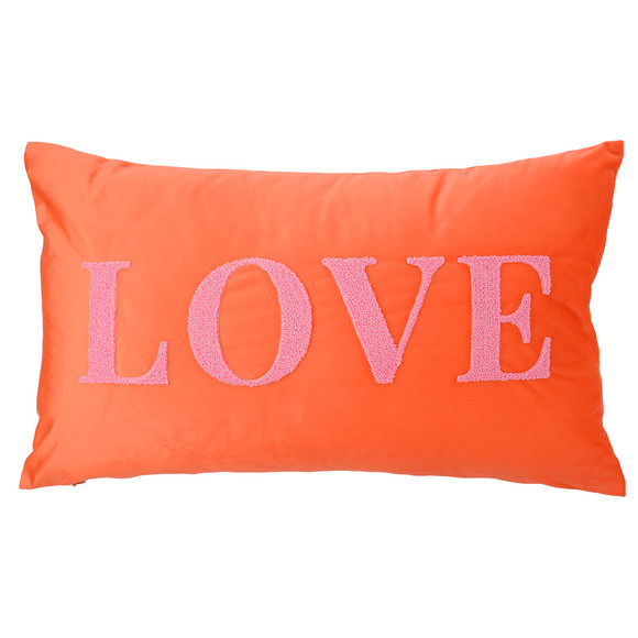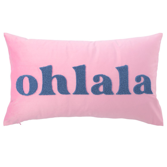 Samtweiche Kissenhülle in Rosa. Mit großem getufften Schriftzug "ohlala" in Blau. Mit Reißverschluss. Ohne Füllung