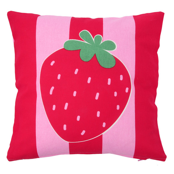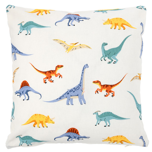 Kissenhülle aus Baumwolle in Blau mit großem Dino-Motiv und dunkelblauen Streifen auf der Vorderseite. Rückseite unifarben Dunkelblau. Schließbar mit Reißverschluss.