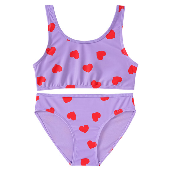 Der verspricht Spaß! Helllila Bikini mit roten Herzen allover. Bikinihose mit paspeliertem Elastikbund sowie hohe Taille. Bustier-Oberteil und Hose komplett gefüttert.