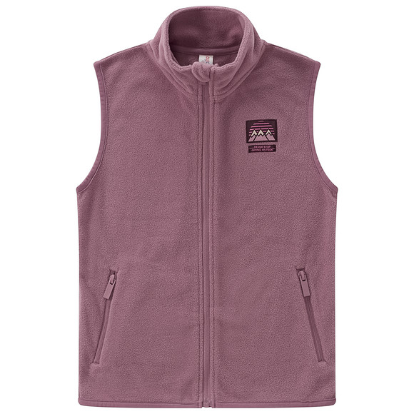 Fleeceweste in Helllila mit Paspel an allen Ausschnitten, Stehkragen und Reißverschluss mit Kinnschutz. Auf der Front mit zwei Zippertaschen sowie mit kleinem Aufnäher auf der linken Brust.