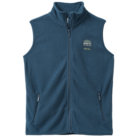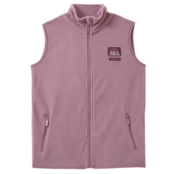 Fleeceweste in Helllila mit Paspel an allen Ausschnitten, Stehkragen und Reißverschluss mit Kinnschutz. Auf der Front mit zwei Zippertaschen sowie mit kleinem Aufnäher auf der linken Brust.