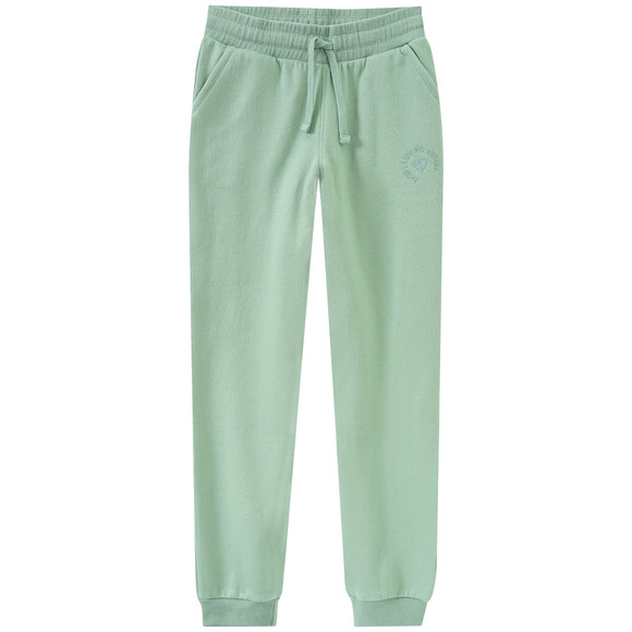 Hellgrüne Jogginghose mit Tunnelzug im Elastikbund, zwei Einschubtaschen vorne und kleine Herzchen-Stickerei auf der linken Tasche. Formstabile Rippenbündchen am Beinabschluss und innen kuschelig weich. Locker geschnitten.