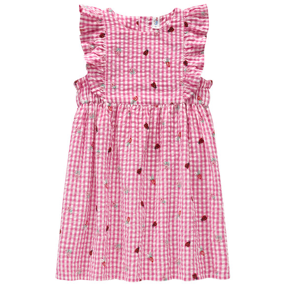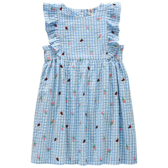 Hellblau-weiß kariertes Kleid mit strukturiertem Material aus Baumwolle. Mit Erdbeeren, Blumen und Marieknäfern bestickt. Rundhalsausschnitt und kurze Knopfleiste hinten. Rüschen an den Armausschnitten. Ausgestelltes Rockteil mit Unterrock.