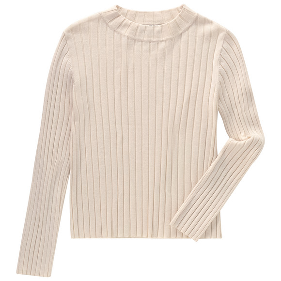Cremefarbenes Langarmshirt aus weichem Viskose-Mix in Ripp-Optik und mit Stehkragen.